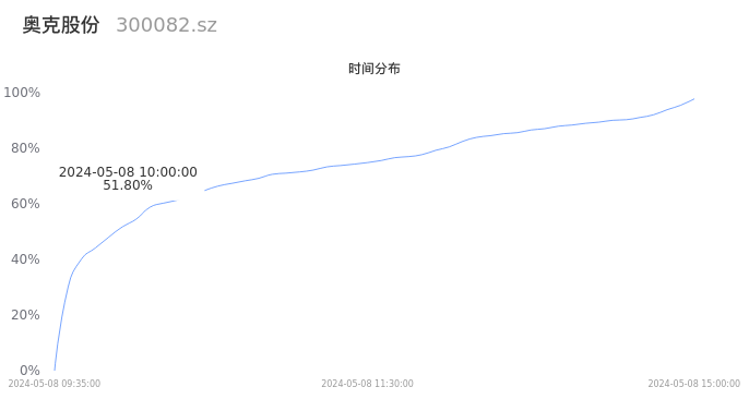 根据成交分布分析,该股票当天放量成交,成交清淡。时间上看,早盘前半小时成交量占据当天总成交量的51.8%;价格上看,成交呈现左偏峰。成交分布分析主要研究股票成交的分布特性,不具有预测功能,请知悉。
