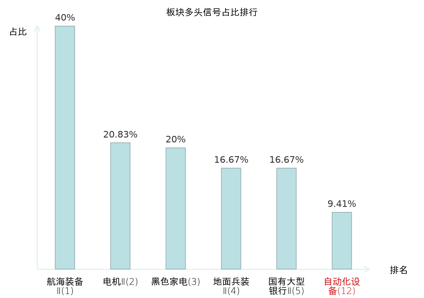 全市场所有行业板块中主力多头信号占比排名中,航海装备Ⅱ板块位居第一。国有大型银行Ⅱ板块名次提升最快,较昨日上升119位。