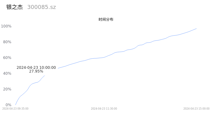 300085银之杰2024年04月23日成交9.19万手,成交金额8633.00万元,相较昨日缩量1833手,换手率1.47%,成交清淡。