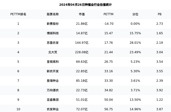 从估值角度看:荃银高科最新市盈率PETTM为26.75,在行业内排名5/20,处于5.23分位。