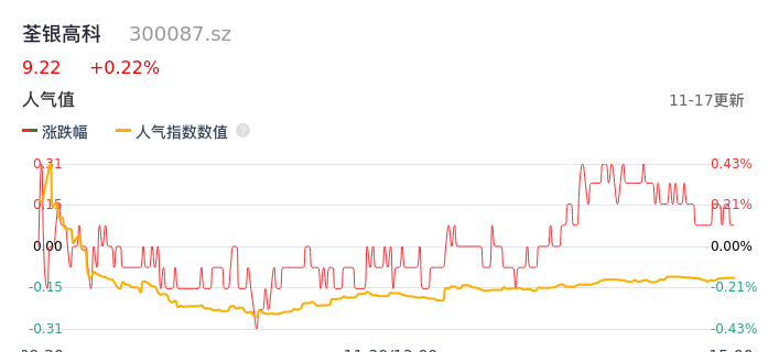 11月17日,荃银高科收报9.22,股价涨幅0.22%,成交金额4689.18万元,换手率0.57%。