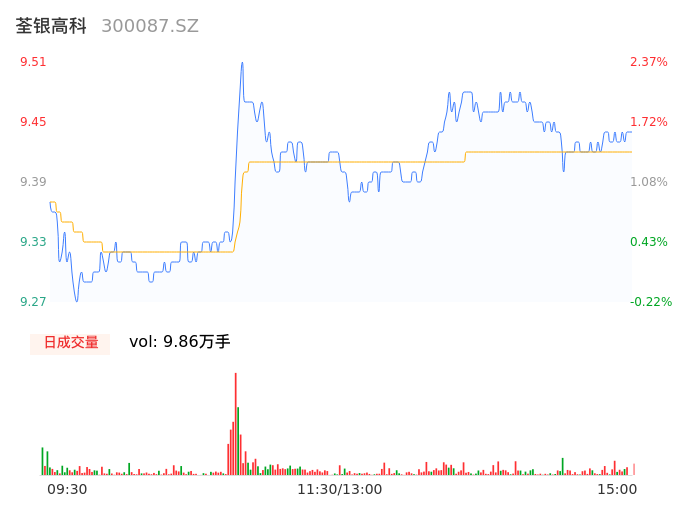 11月23日,荃银高科收报9.44,股价涨幅1.61%,成交金额9287.83万元,换手率1.10%。