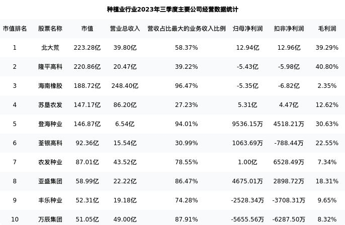 荃银高科最新报告期数据为三季度,下表汇总了种植业行业内市值靠前的公司三季度主要经营数据