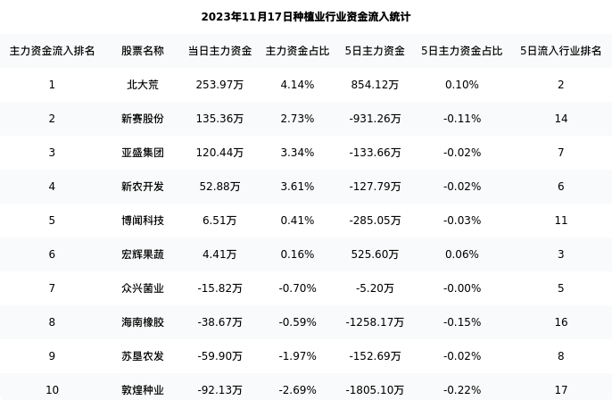 从主力资金流向来看,种植业行业今日主力资金流入1.16亿元,在所有申万二级行业中排名:75/131。