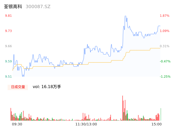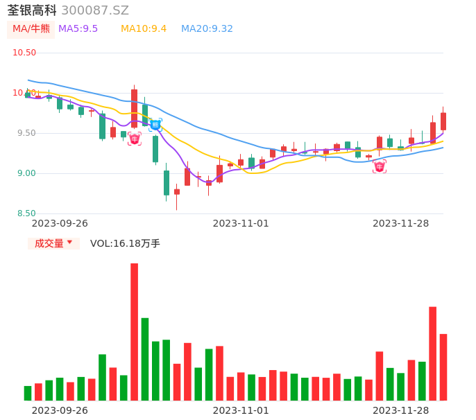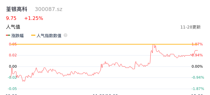 11月28日,荃银高科收报9.75,股价涨幅1.25%,成交金额1.56亿元,换手率1.81%。