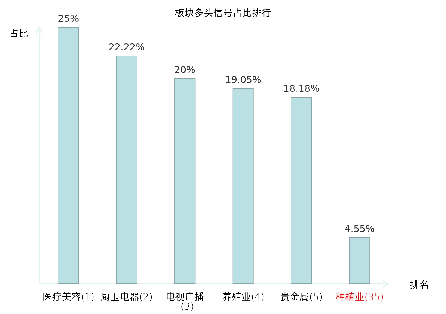 全市场所有行业板块中主力多头信号占比排名中,医疗美容板块位居第一。医疗美容板块名次提升最快,较昨日上升126位。