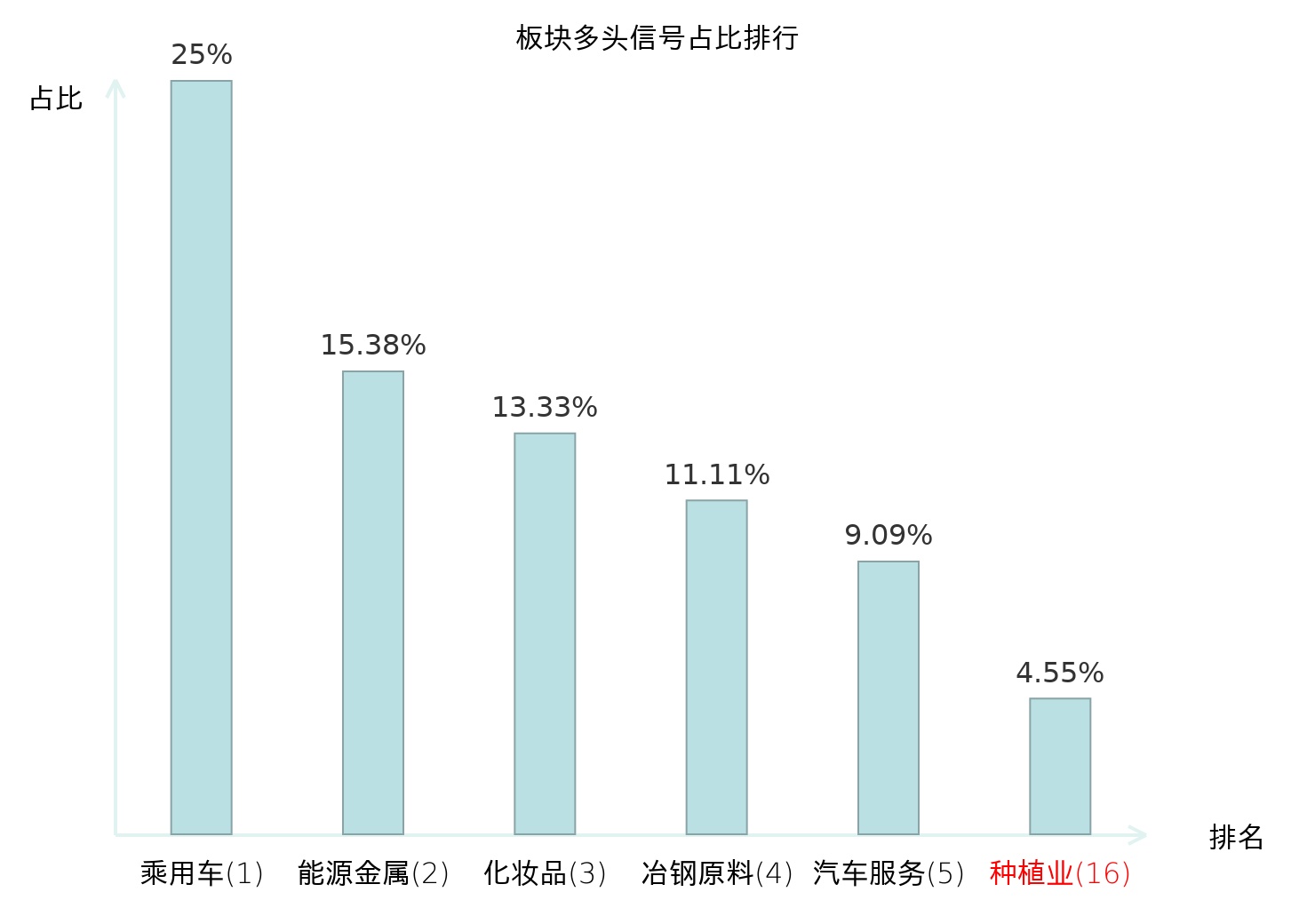 全市场所有行业板块中主力多头信号占比排名中,乘用车板块位居第一。能源金属板块名次提升最快,较昨日上升110位。