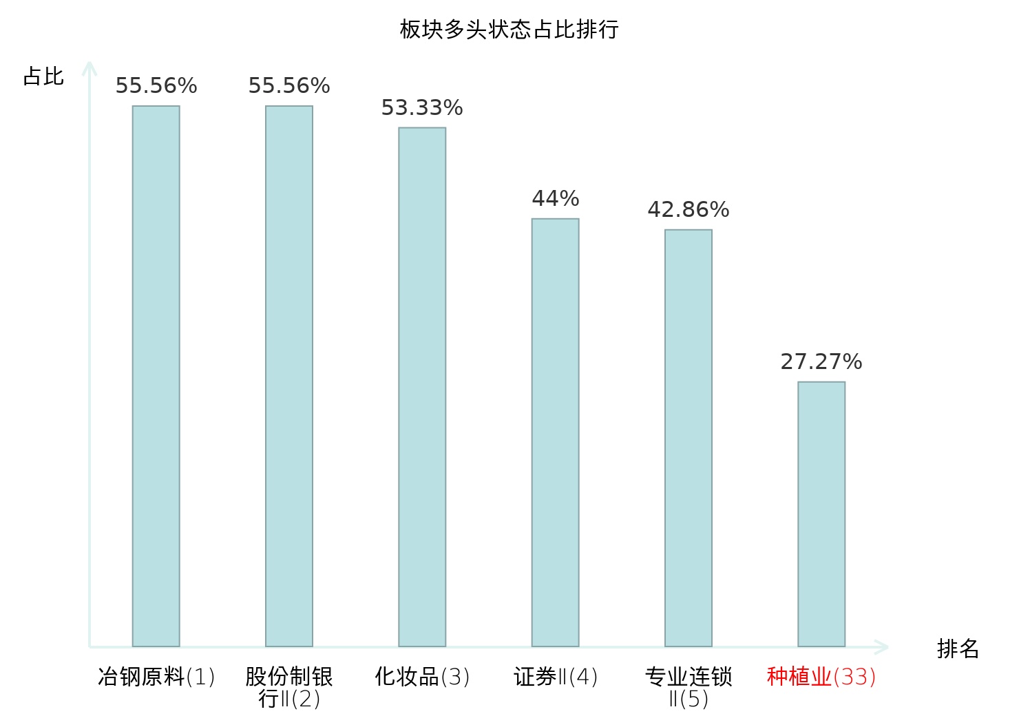 全市场所有行业板块中主力多头状态占比排名中,冶钢原料板块位居第一。保险Ⅱ板块名次提升最快,较昨日上升114位。