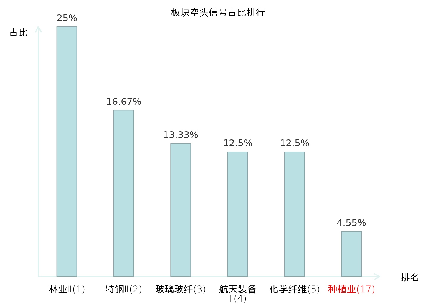 全市场所有行业板块中主力空头信号占比排名中,林业Ⅱ板块位居第一。其他电源设备Ⅱ板块名次提升最快,较昨日上升115位。
