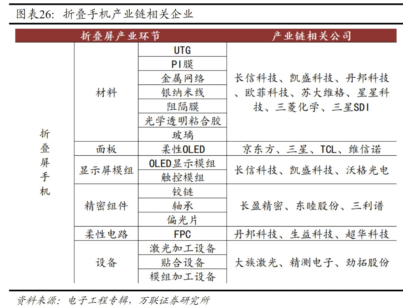折叠手机产业链企业较多,受益折叠手机快速放量增长,相关企业有望受益。该机构整理的折叠手机产业链显示,涉及材料长信科技、欧菲科技;面板京东方A、TCL科技、维信诺;精密组件长盈精密、东睦股份等多家A股公司。