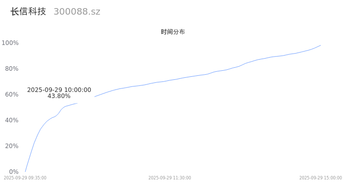 根据成交分布分析,该股票当天放量成交,成交清淡。时间上看,早盘前半小时成交量占据当天总成交量的43.8%;价格上看,成交呈现中间峰。成交分布分析主要研究股票成交的分布特性,不具有预测功能,请知悉。