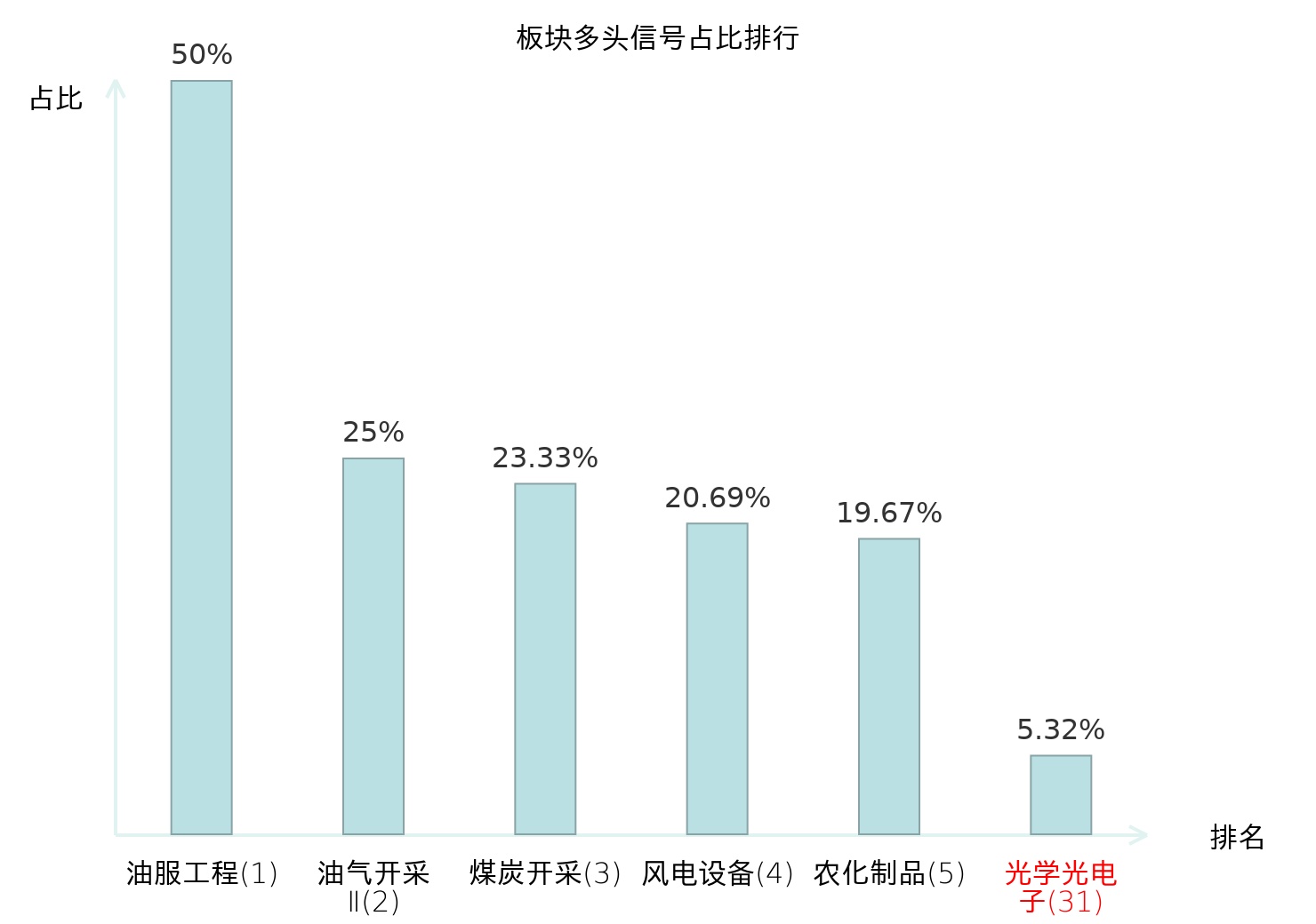 全市场所有行业板块中主力多头信号占比排名中,油服工程板块位居第一。油气开采Ⅱ板块名次提升最快,较昨日上升125位。