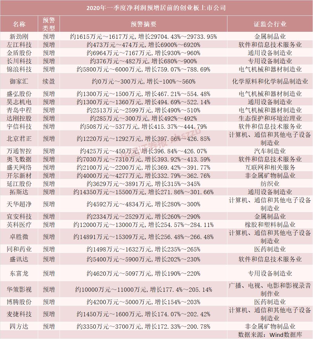 净利润绝对值方面,131家创业板上市公司预计2020年1-3月份实现归属于上市公司股东的净利润超过5000万元,53家超过1亿元,11家超过3亿元。