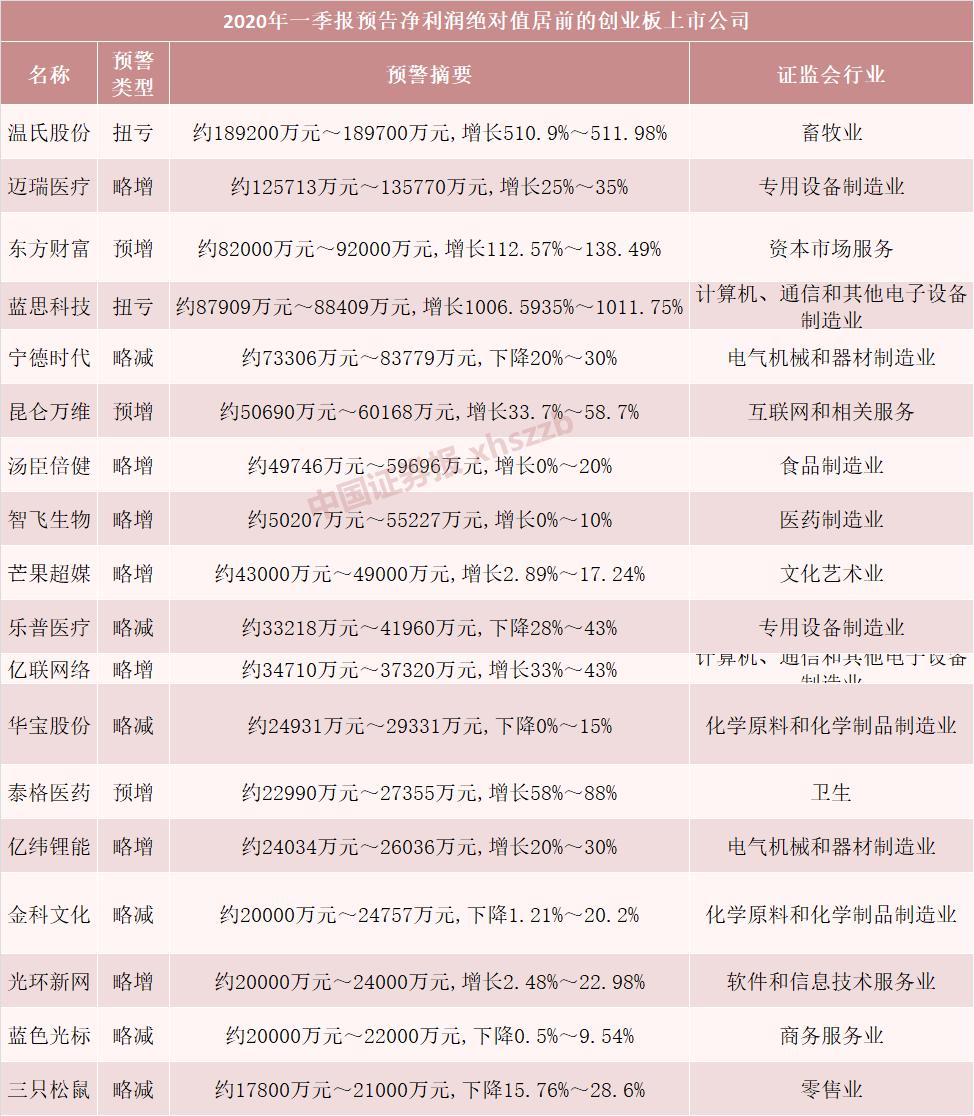 温氏股份(300498)、迈瑞医疗(300760)、东方财富(300059)、蓝思科技(300433)、宁德时代(300750)、昆仑万维(300418)、汤臣倍健(300146)、智飞生物(300122)等8家上市公司预计2020年一季度实现归属于上市公司股东的净利润超过5亿元。