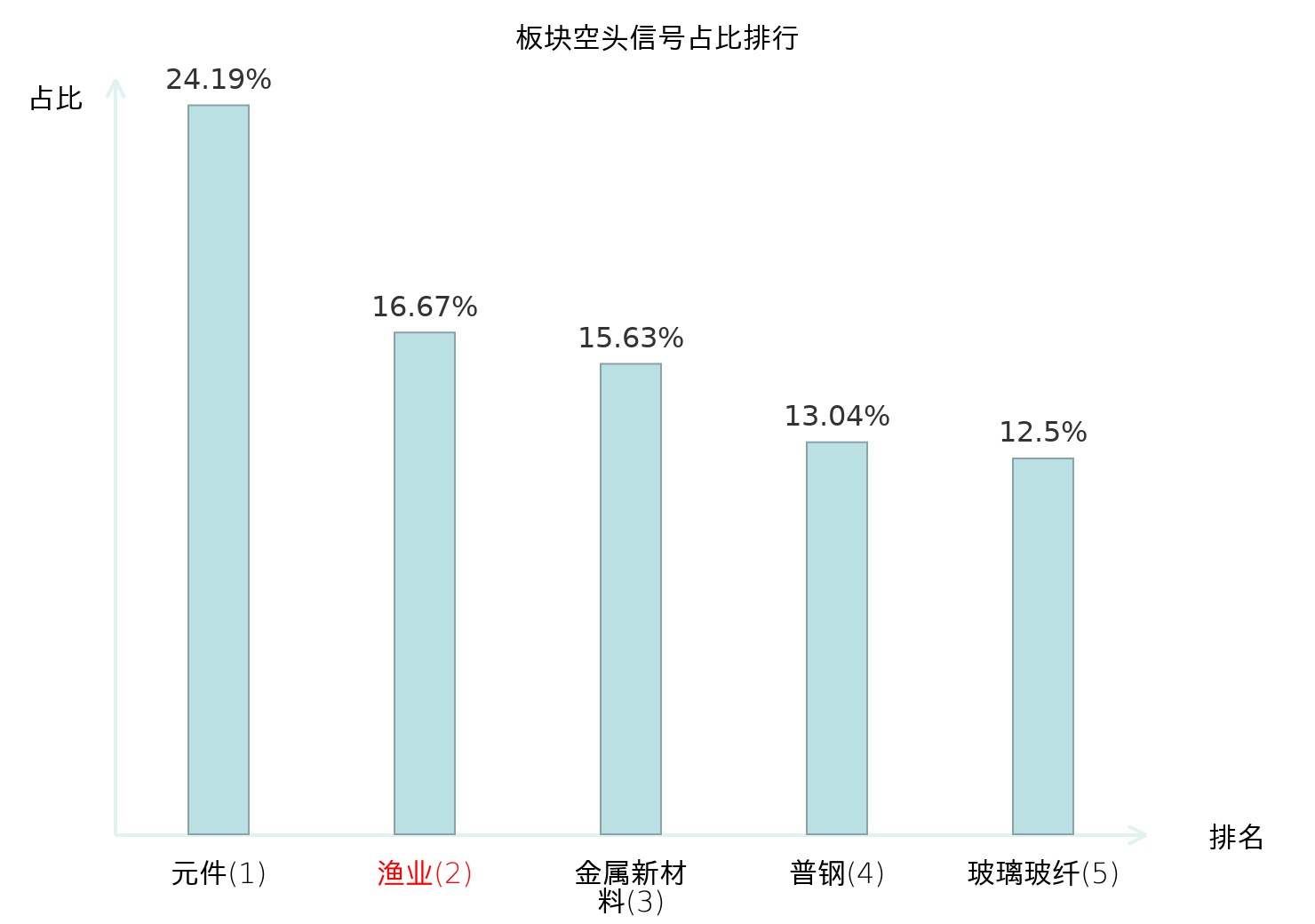 从主力宝信号数据分析,国联水产所属的渔业板块中共1只股票发出主力空头信号,主力空头信号占比在全行业中排名第2位,较昨日上升81位;较高的排名表明主力对于该板块整体卖出意愿较强,此次排名大幅上升可能反映了主力对该板块态度的显著变化。全市场所有行业板块中主力空头信号占比排名中,元件板块位居第一;电子化学品Ⅱ板块名次提升最快,较昨日上升115位;这些变动揭示了不同行业间主力资金偏好的结构性调整,为投资者评估市场风险分布与潜在压力区域提供了客观依据。