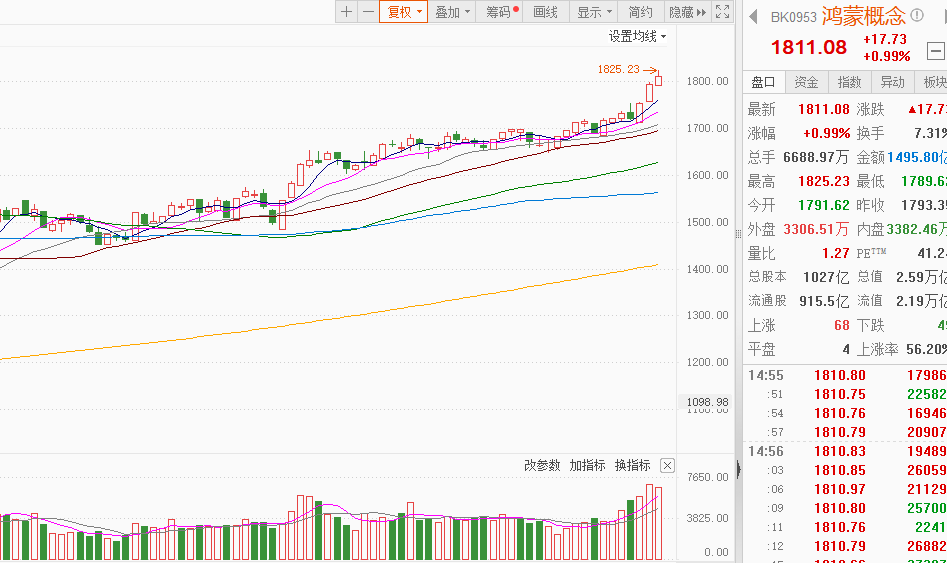 事件驱动:鸿蒙概念震荡走强 诚迈科技20cm涨停,海能技术、高新兴涨超10%,飞利信、润和软件、岩山科技、慧为智能、金现代、九联科技等涨幅靠前。消息面上,8月16日,央视《对话》聚焦鸿蒙生态的最新进展,华为常务董事、终端BG董事长余承东首先披露了鸿蒙最新进展,目前,鸿蒙5.0终端数量已突破一千万。这标志着,鸿蒙操作系统生态迈过关键门槛。