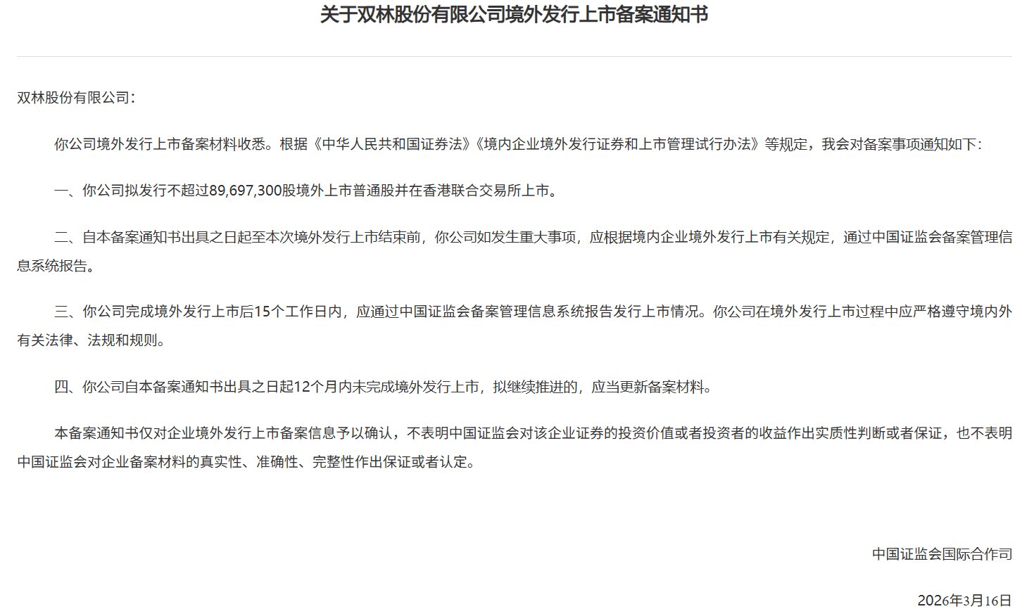 3月23日,中国证监会国际合作司发布《关于双林股份有限公司境外发行上市备案通知书》。双林股份(300100.SZ)拟发行不超过89,697,300股境外上市普通股并在香港联合交易所上市。