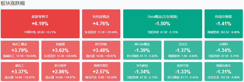 板块方面,化工、海南、电池等板块涨幅居前,软件开发、游戏等板块跌幅居前。截至收盘,沪指跌0.16%,深成指跌0.16%,创业板指跌0.37%。