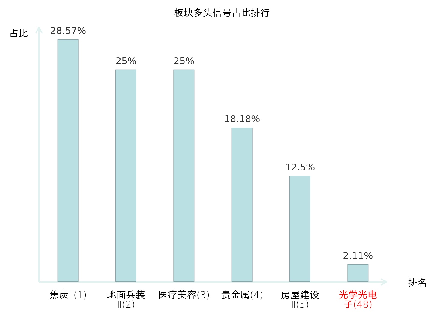 全市场所有行业板块中主力多头信号占比排名中,焦炭Ⅱ板块位居第一。医疗美容板块名次提升最快,较昨日上升124位。