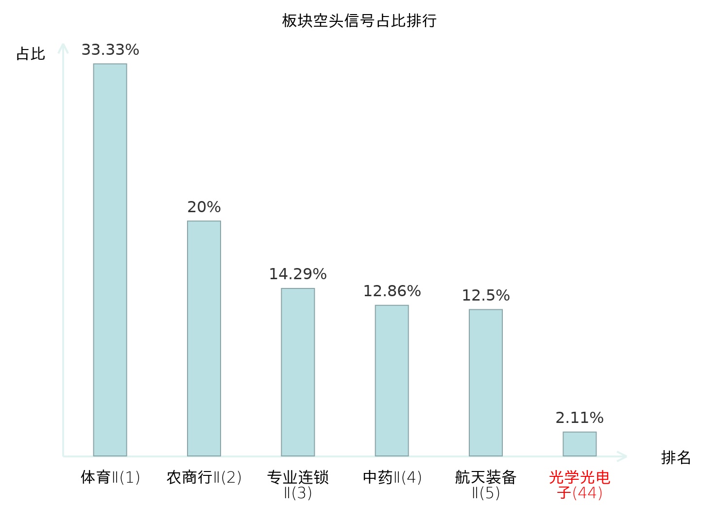 全市场所有行业板块中主力空头信号占比排名中,体育Ⅱ板块位居第一。医药商业板块名次提升最快,较昨日上升107位。