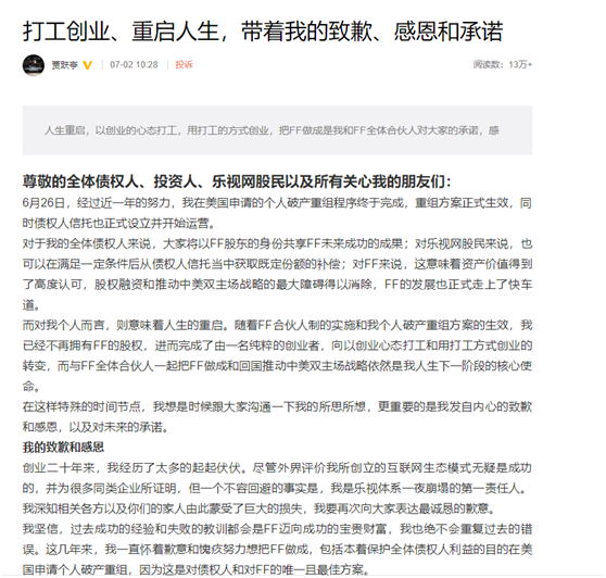 今日,贾跃亭在微博上发了一封公开信,称其在美国申请的个人破产重组程序完成,重组方案正式生效,同时债权人信托也正式设立并开始运营。