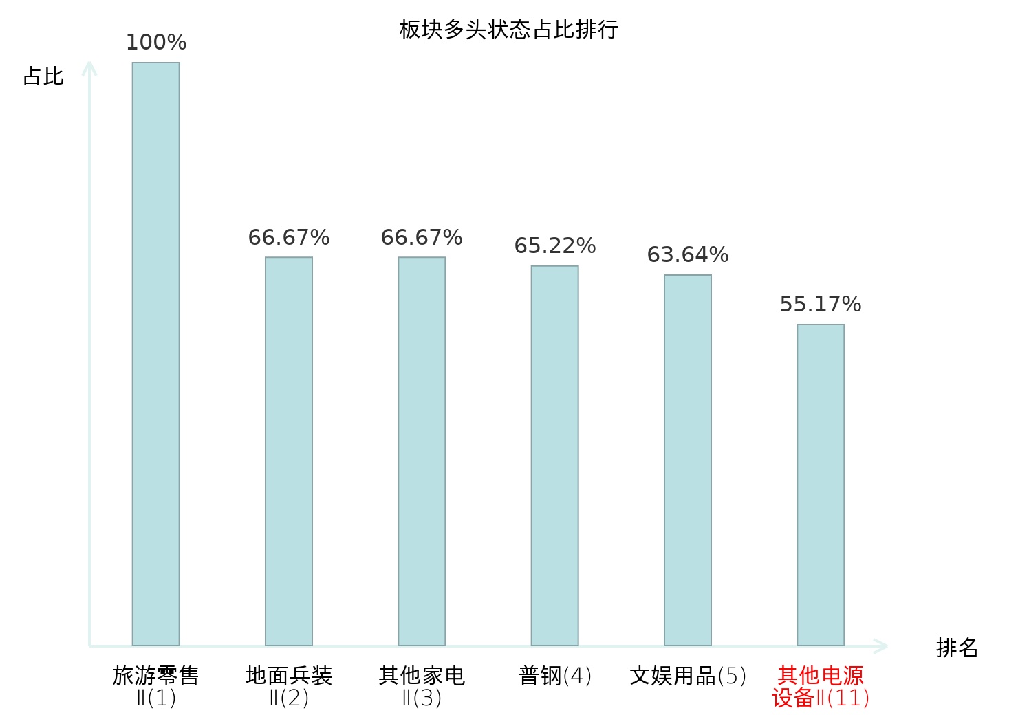 全市场所有行业板块中主力多头状态占比排名中,旅游零售Ⅱ板块位居第一。农商行Ⅱ板块名次提升最快,较昨日上升95位。