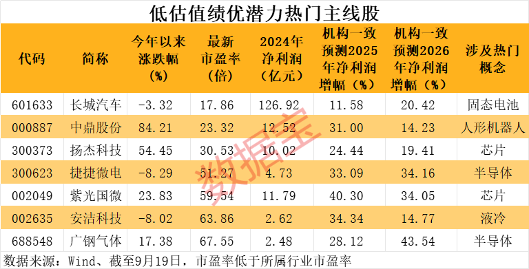 根据上述逻辑,数据宝筛选出7只投资者关注度较高的低估值绩优潜力热门主线股,主要条件包括:1.上周互动问答超过5条;2.公司所属概念涉及上文提及的热门主线;3.公司最新市盈率低于所属行业的市盈率;4.机构一致预测公司2025年、2026年净利润增幅持续超过10%。