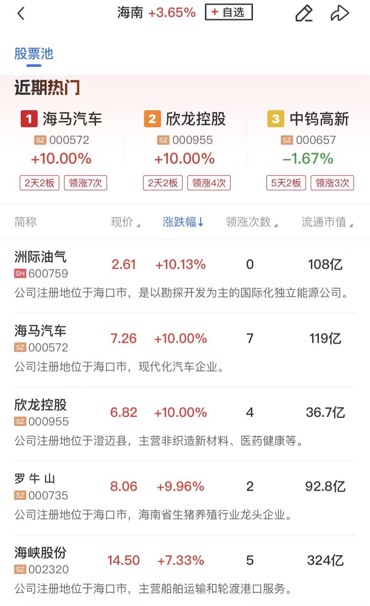 板块上,海南自贸区概念股再度走强,欣龙控股、海马汽车、罗牛山等涨停,海南发展、海峡股份、金盘科技等涨幅居前。
