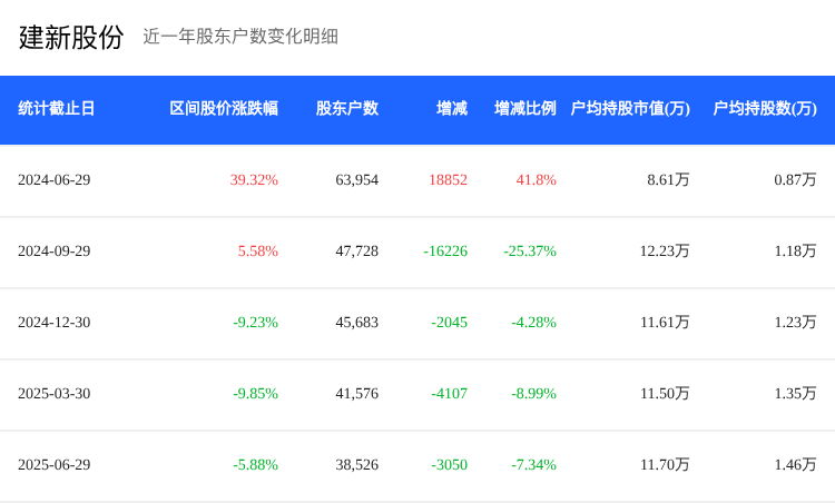 截至2025年6月30日,建新股份(300107)的股东户数为3.85万,较上期减少了7.34%。与此同时,户均持股数量增至7.97万股,环比增长1.72%,户均持股市值为11.70万元。这些变化反映了股东结构的集中化趋势。