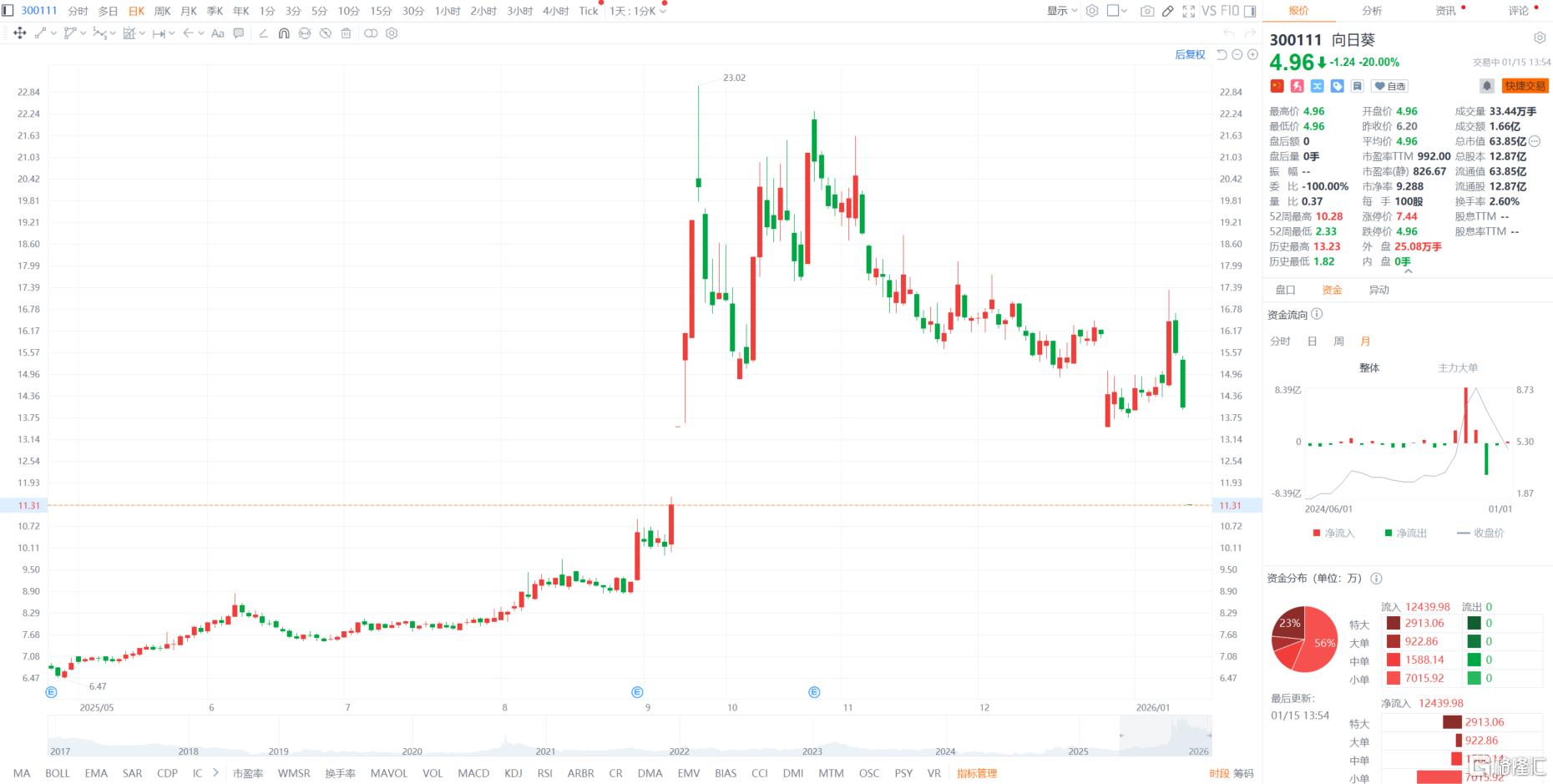 受此影响,向日葵今日开盘即20CM一字跌停,现报4.96元,总市值63.85亿元。