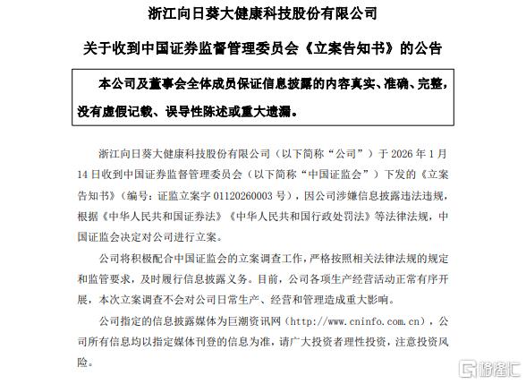 据公告称,公司于2026年1月14日收到中国证监会下发的《立案告知书》。