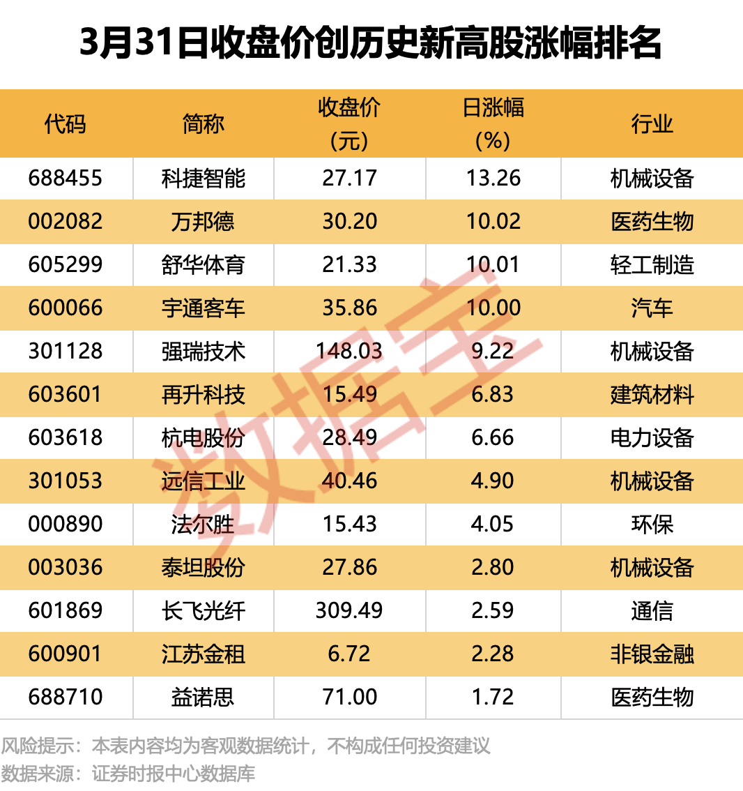 收盘价创历史新高股中,今日股价平均上涨6.49%,涨停的有万邦德、舒华体育、宇通客车等,涨幅居前的有科捷智能、强瑞技术、再升科技等。