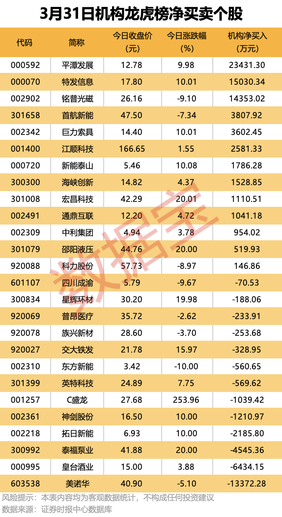 机构净卖出个股中,美诺华遭机构净卖出近1.34亿元,居首;紧随其后是皇台酒业、泰福泵业等,净卖出金额均超4000万元。