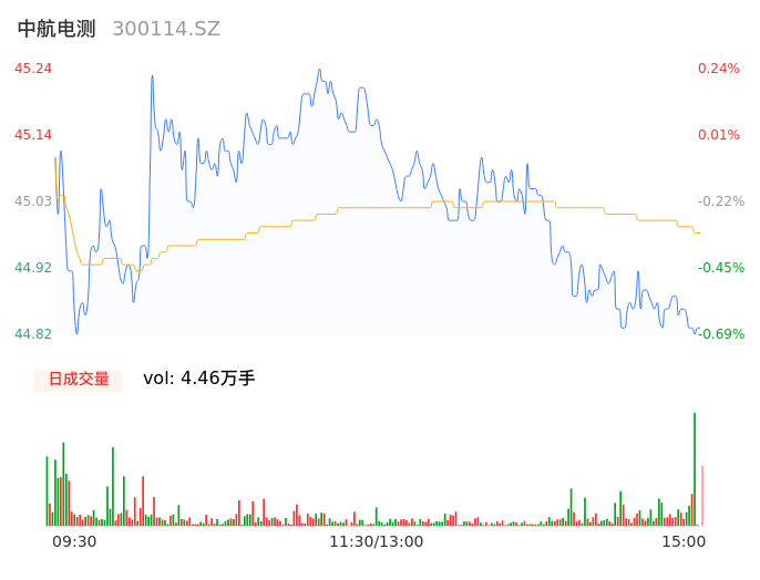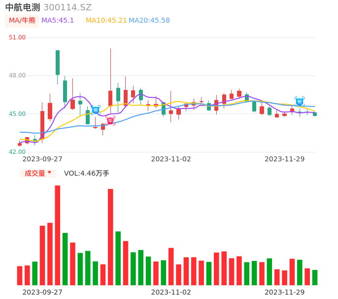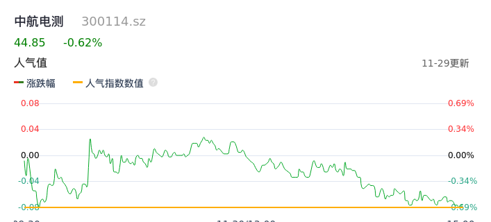 11月29日,中航电测收报44.85,股价涨幅-0.62%,成交金额2.00亿元,换手率0.75%。