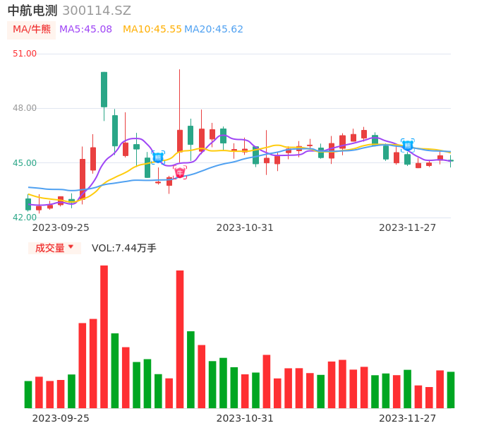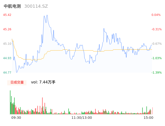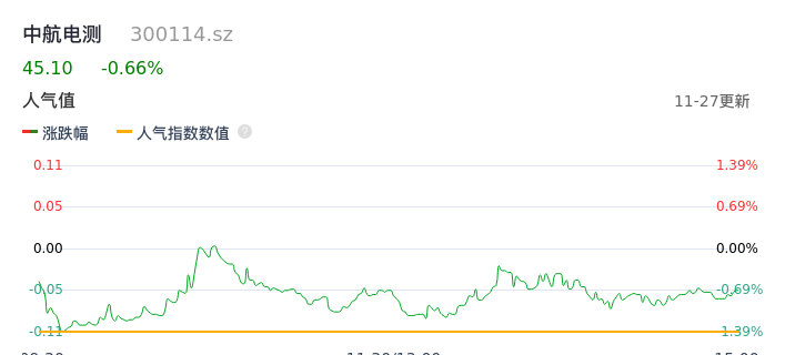 11月27日,中航电测收报45.10,股价涨幅-0.66%,成交金额3.35亿元,换手率1.26%。
