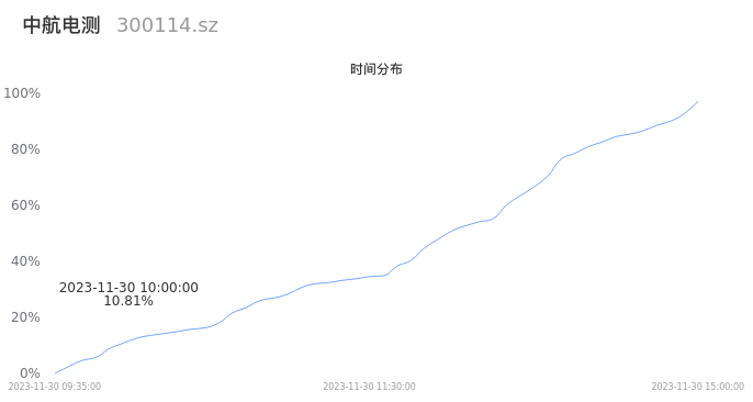 300114中航电测2023年11月30日成交7.91万手,成交金额3.49亿元,相较昨日放量3.46万手,换手率1.34%,成交清淡。