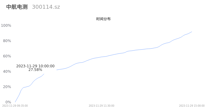 300114中航电测2023年11月29日成交4.46万手,成交金额2.00亿元,相较昨日缩量4698手,换手率0.75%,成交清淡。