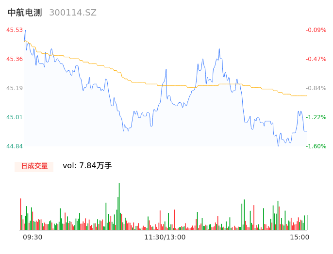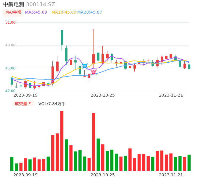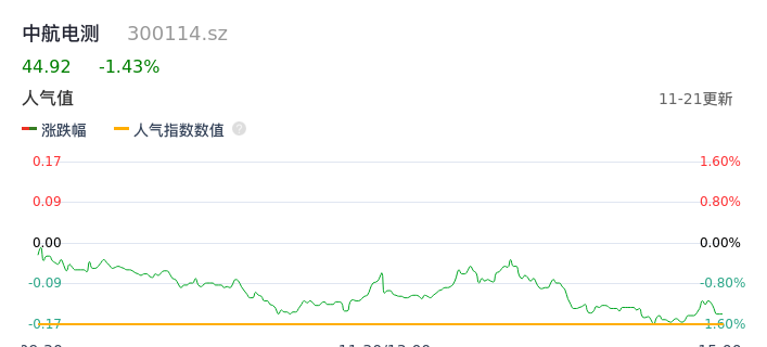 11月21日,中航电测收报44.92,股价涨幅-1.43%,成交金额3.54亿元,换手率1.33%。