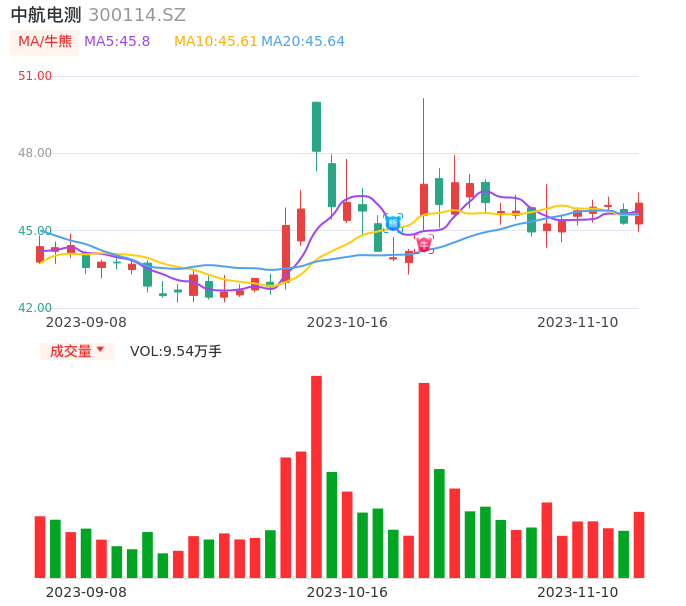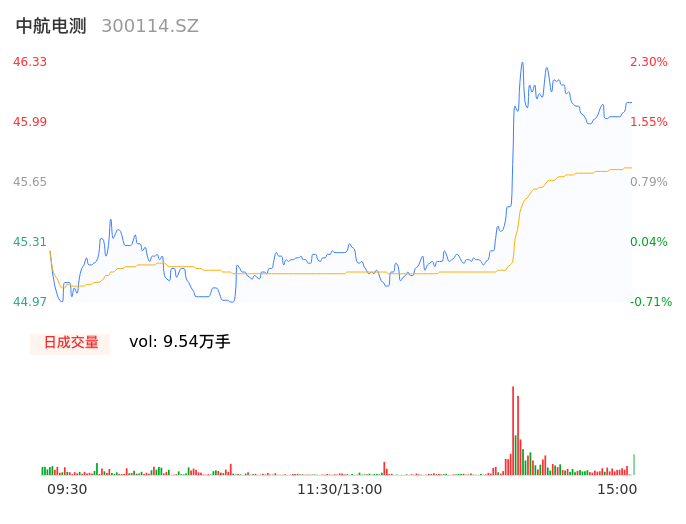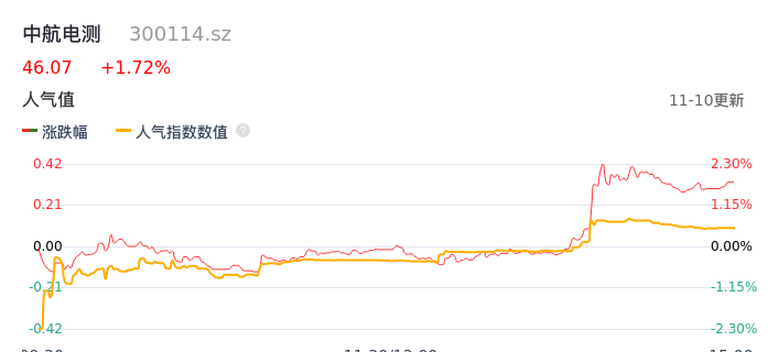 11月10日,中航电测收报46.07,股价涨幅1.72%,成交金额4.36亿元,换手率1.61%。