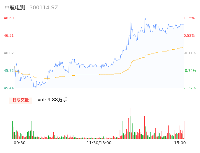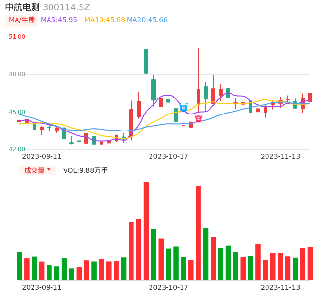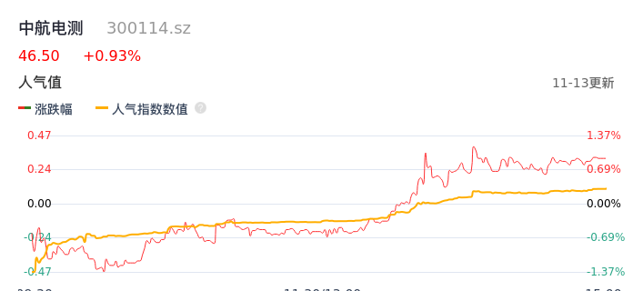 11月13日,中航电测收报46.50,股价涨幅0.93%,成交金额4.56亿元,换手率1.67%。