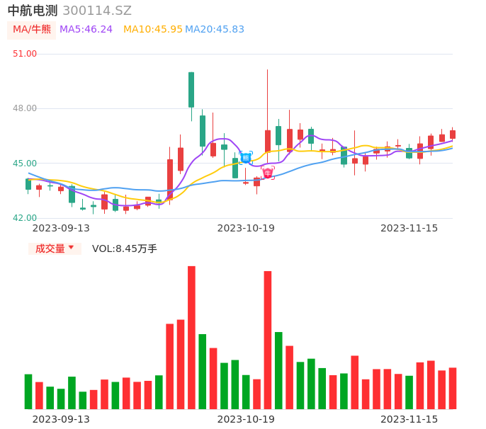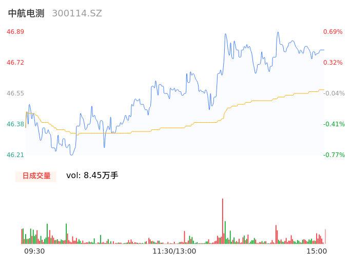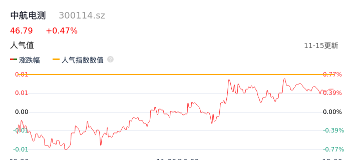 11月15日,中航电测收报46.79,股价涨幅0.47%,成交金额3.94亿元,换手率1.43%。
