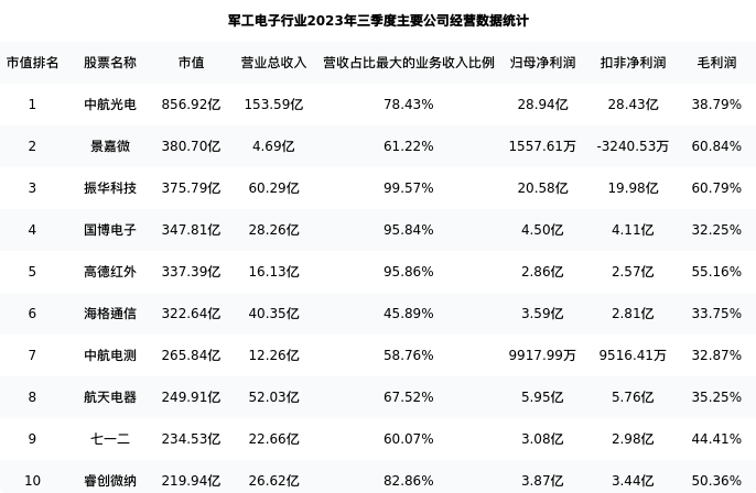 中航电测最新报告期数据为三季度,下表汇总了军工电子行业内市值靠前的公司三季度主要经营数据