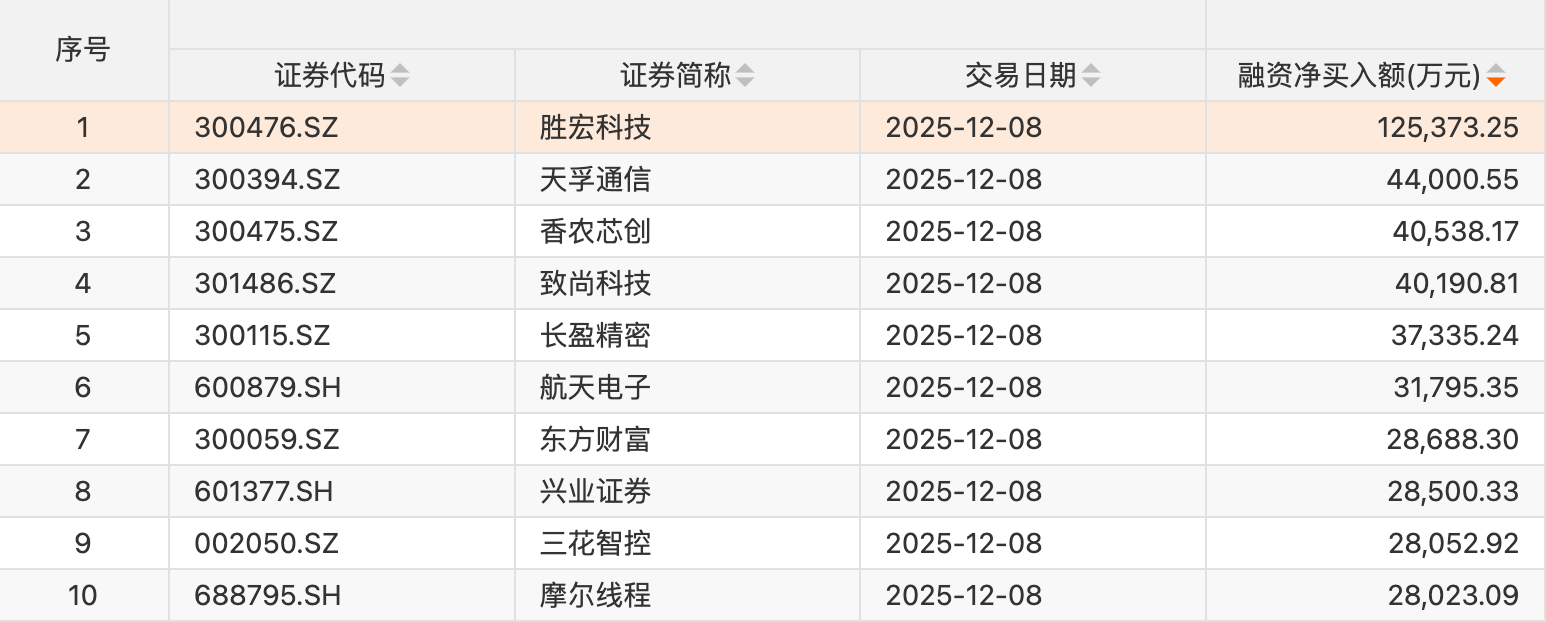 个股方面,49只个股获融资净买入额超1亿元。胜宏科技获融资净买入额居首,净买入12.54亿元;融资净买入额居前的还有天孚通信、香农芯创、致尚科技、长盈精密、航天电子、东方财富、兴业证券、三花智控、摩尔线程等。