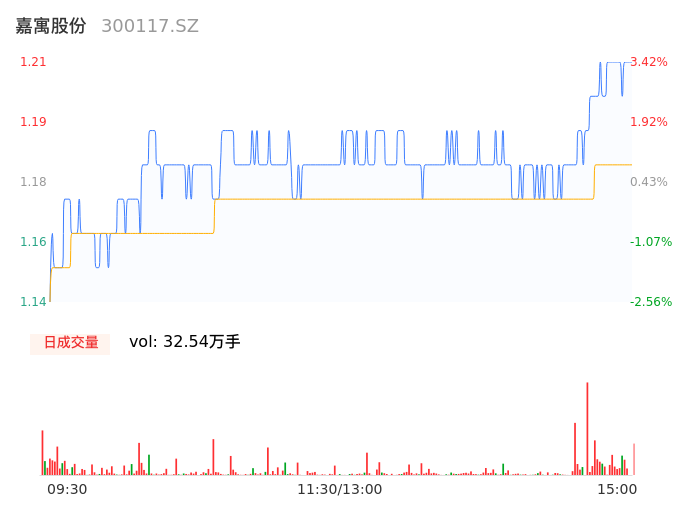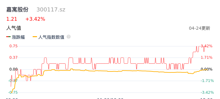 04月24日,嘉寓股份收报1.21,股价涨幅3.42%,成交金额3839.26万元,换手率4.54%。