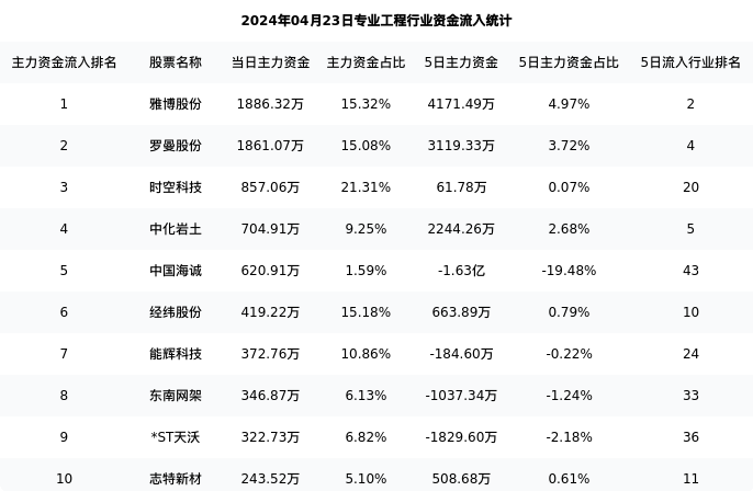 从主力资金流向来看,专业工程行业今日主力资金流入11.38亿元,在所有申万二级行业中排名:16/131。