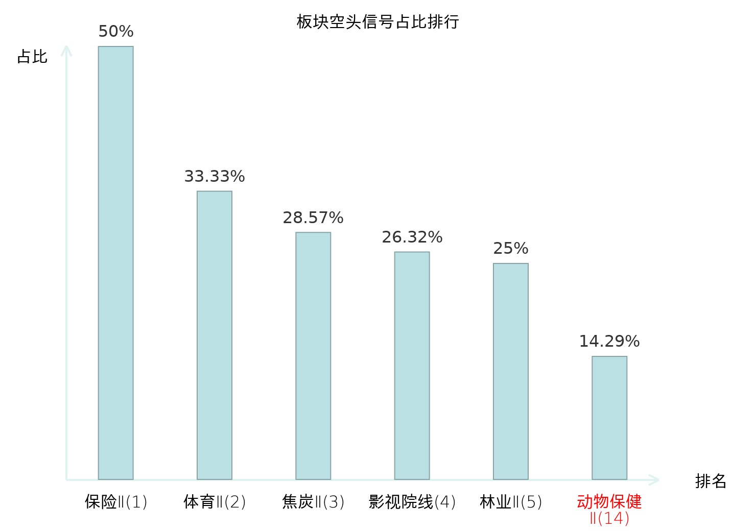全市场所有行业板块中主力空头信号占比排名中,保险Ⅱ板块位居第一。装修建材板块名次提升最快,较昨日上升118位。