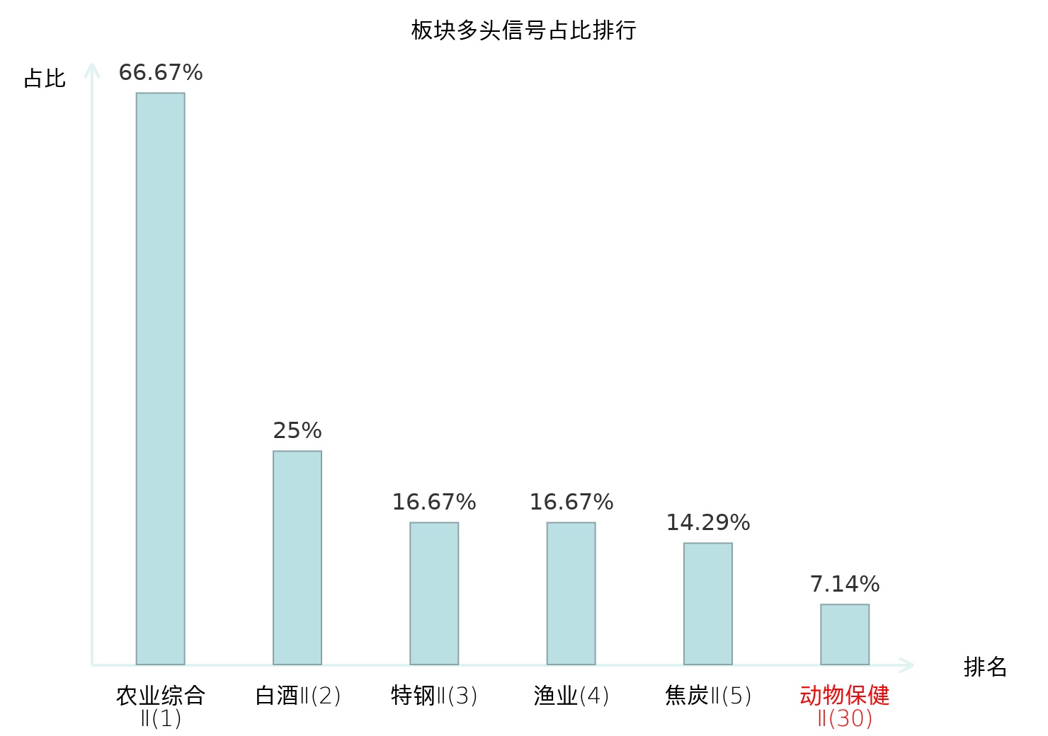 全市场所有行业板块中主力多头信号占比排名中,农业综合Ⅱ板块位居第一。农业综合Ⅱ板块名次提升最快,较昨日上升127位。