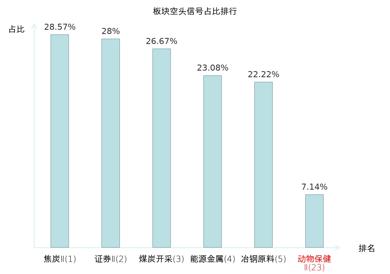 全市场所有行业板块中主力空头信号占比排名中,焦炭Ⅱ板块位居第一。煤炭开采板块名次提升最快,较昨日上升128位。