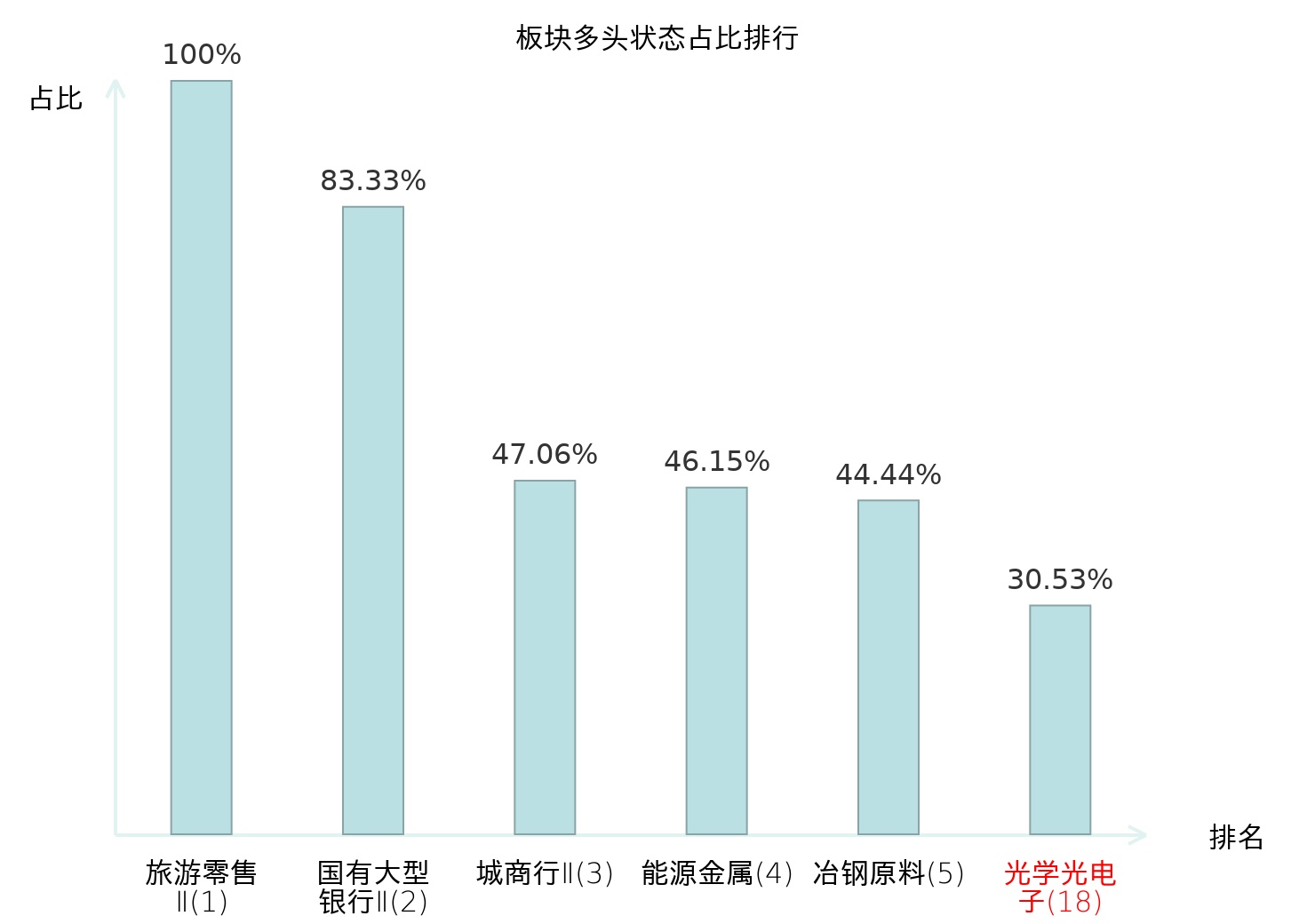 从主力宝信号数据分析,经纬辉开所属的光学光电子板块中共有29只股票处于主力多头状态,主力多头状态占比在全行业中排名第18位,较昨日上升了9位。排名上升表明主力对于该板块整体看多意愿有所增强。全市场所有行业板块中,旅游零售Ⅱ板块的主力多头状态占比最高,位居第一;照明设备Ⅱ板块名次提升最快,较昨日上升了59位。这些变动揭示了不同行业间主力资金偏好的调整,为投资者提供了关于市场情绪和潜在投资机会的重要线索。