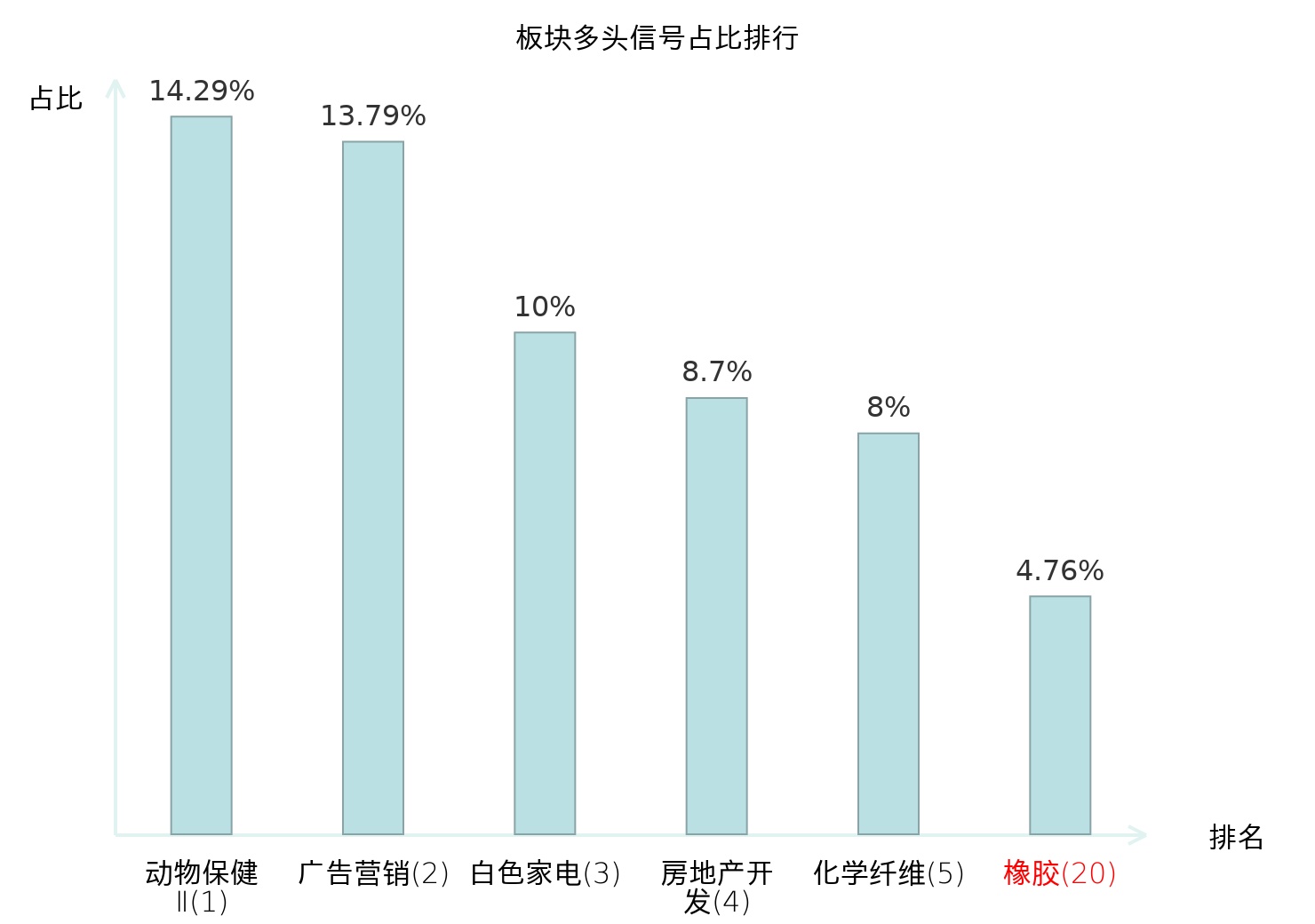 全市场所有行业板块中主力多头信号占比排名中,动物保健Ⅱ板块位居第一。动物保健Ⅱ板块名次提升最快,较昨日上升100位。